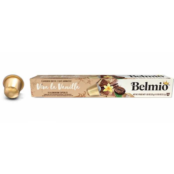 Entdecken Sie die luxuriösen Belmio Viva La Vanilla Kapseln für Nespresso-Maschinen. Genießen Sie bei jedem Schluck den reichen und cremigen Vanillegeschmack. Die Mischung aus gemahlenem Kaffee, natürlichem Vanillearoma und Vanilleextrakt bietet ein intensives Geschmackserlebnis mit einer feinen Vanillenote, die Ihren Kaffee zu einem besonderen Genuss macht.