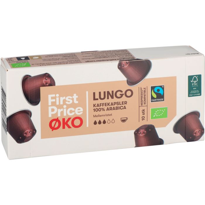 Bio Lungo Kaffeekapseln von First Price fur Nespresso-kompatible Maschinen. Die 10 Kapseln bieten aromatischen Kaffeegenuss in Bio-Qualitat auf Knopfdruck.